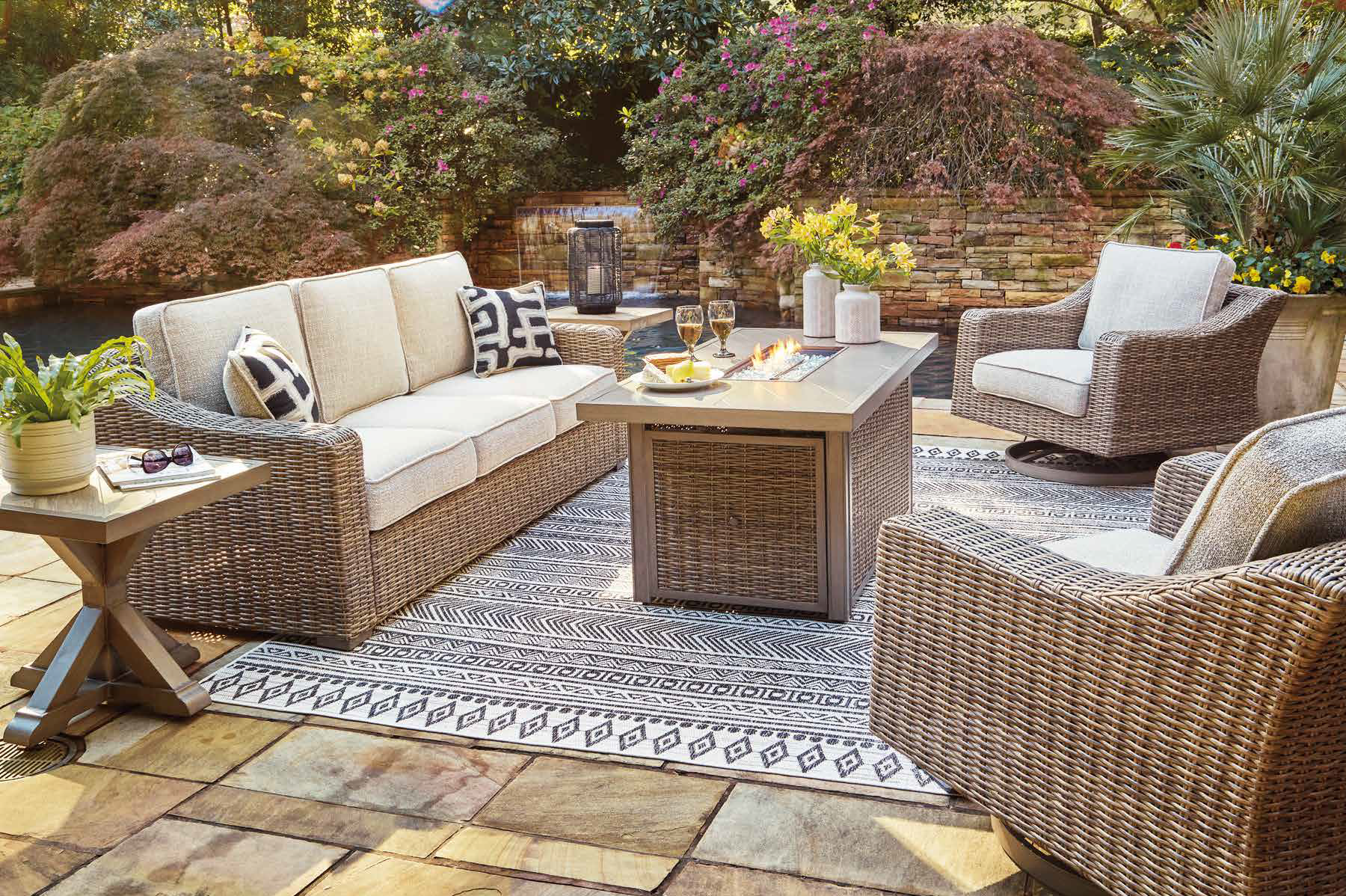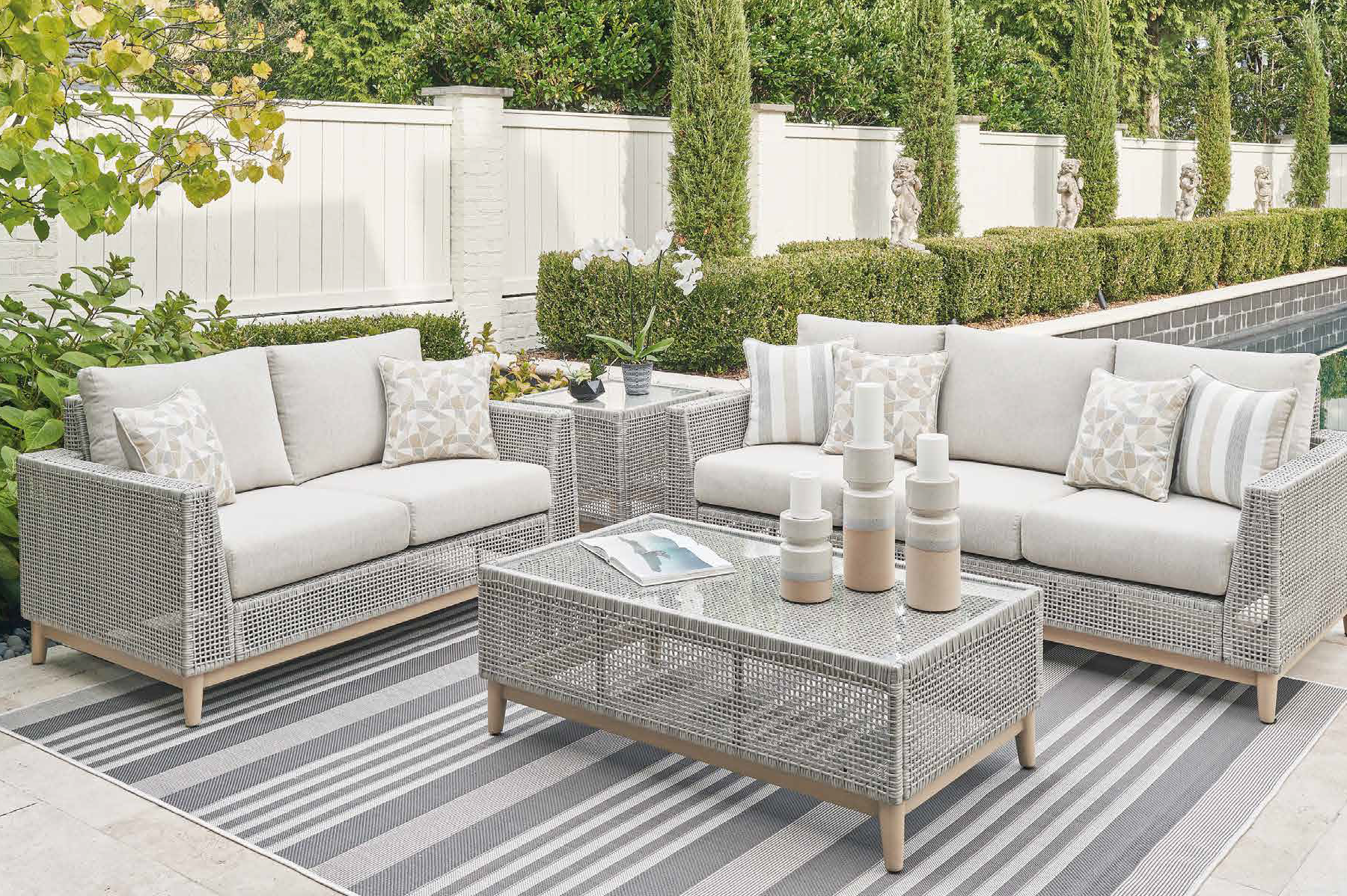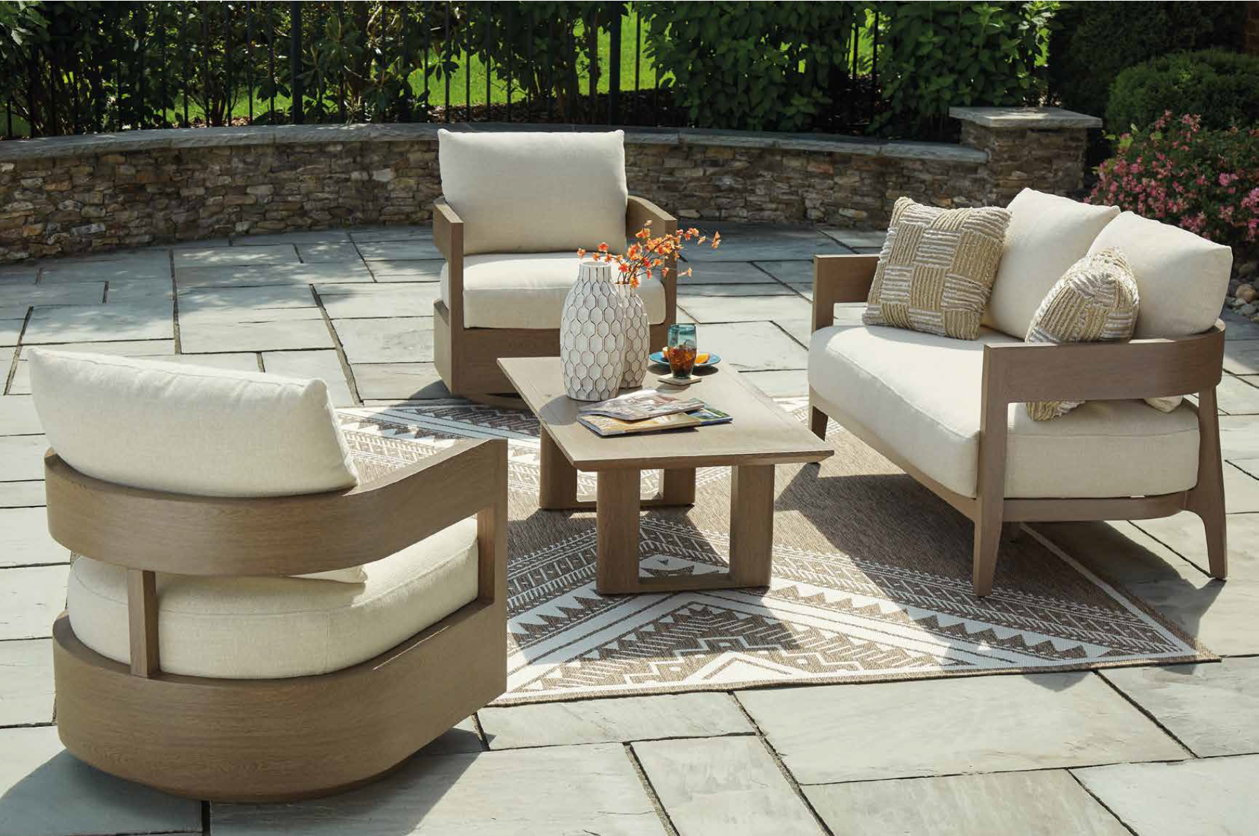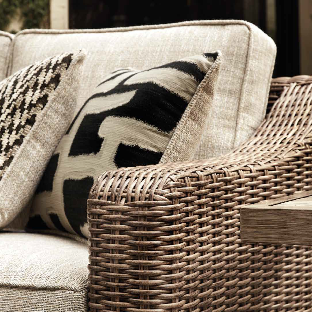 Made from high-performance materials such as aluminum with a protective coating, synthetic wicker, treated woods and Nuvella® fabrics, which withstand sun, rain and humidity without losing style or comfort.