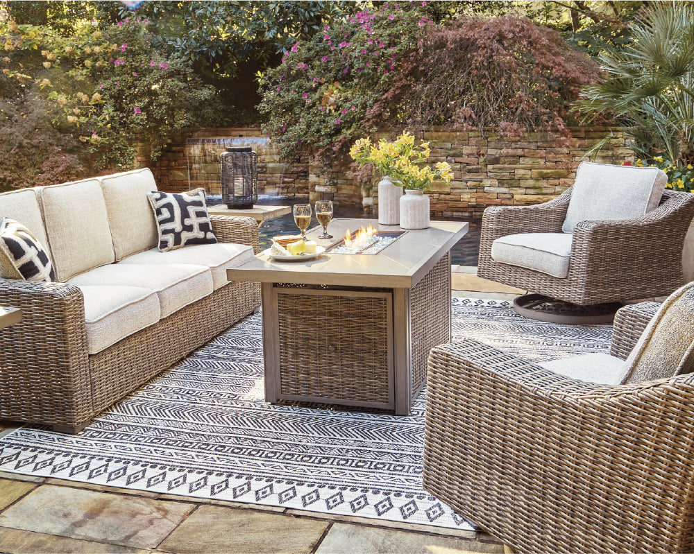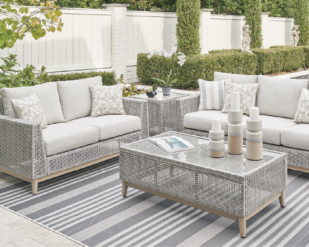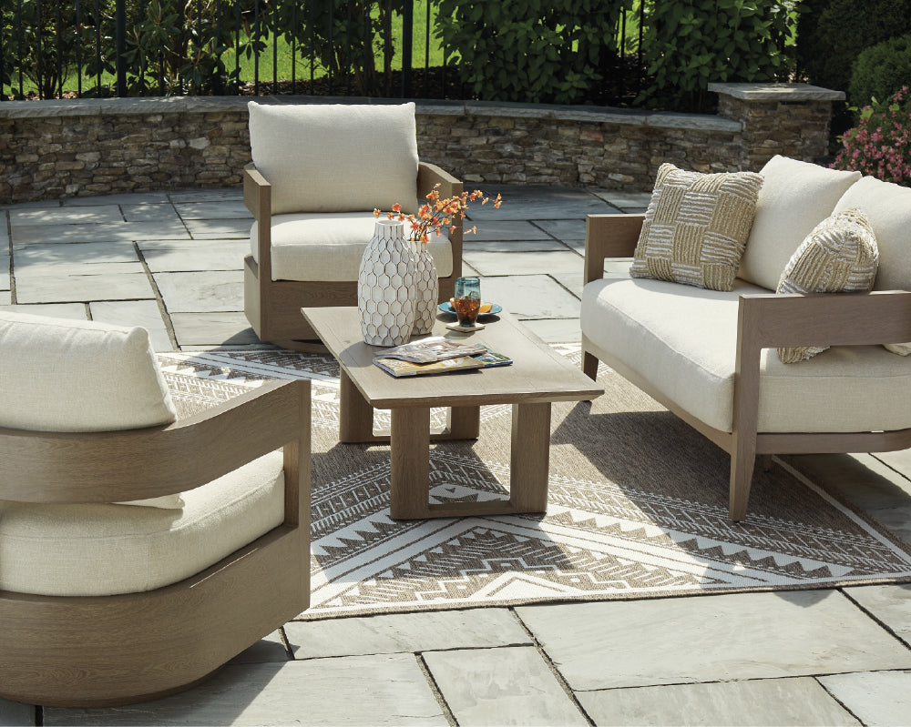 Fabricados en materiales de alto esempeño como aluminio con recubrimiento protector, mimbre sintético, maderas tratadas y telas Nuvella®, que soportan el sol, la lluvia y la humedad sin perder estilo ni confort.